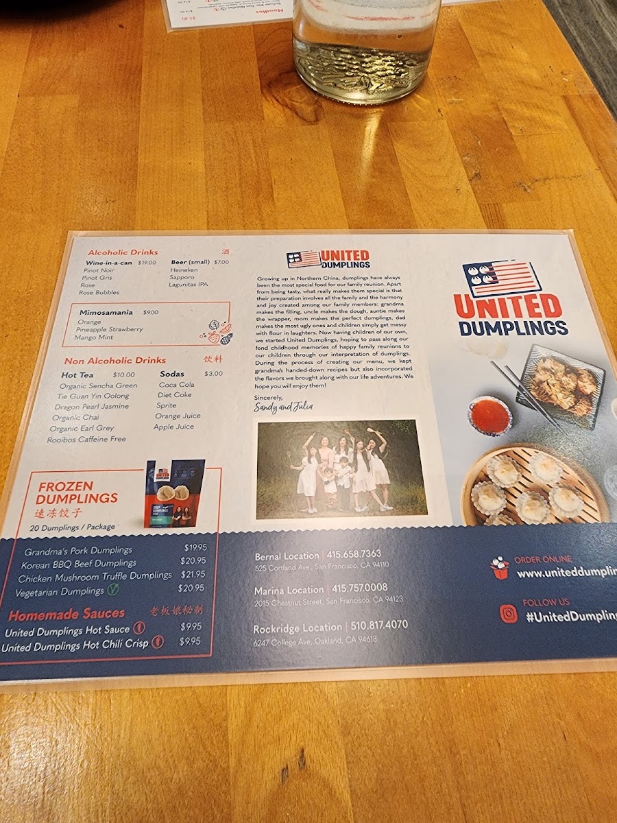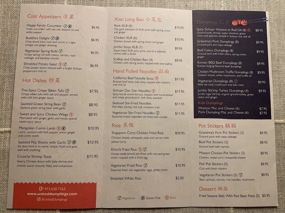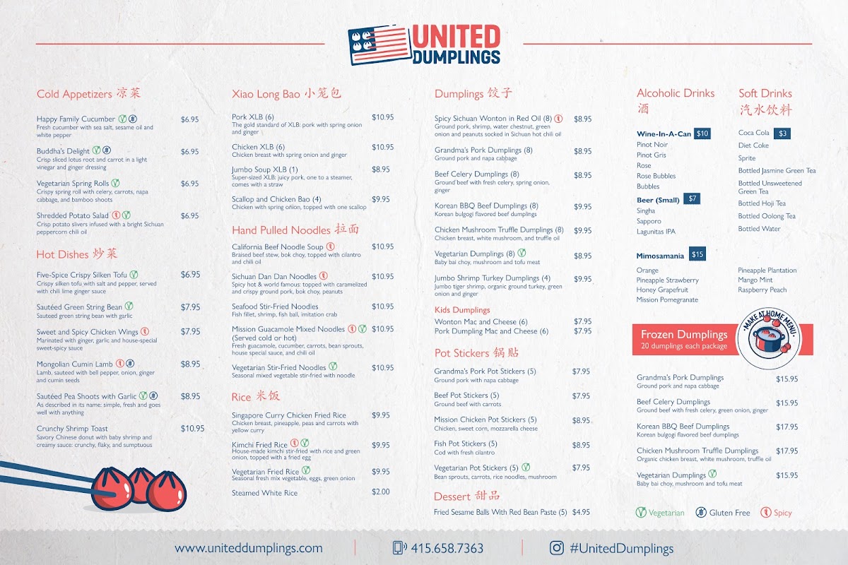 If you're in San Francisco and craving some seriously delicious dumplings, the United Dumplings Menu is definitely worth checking out. Located at 525 Cortland Ave, this cozy spot serves up a variety of mouthwatering dumplings that are perfect for any occasion. Whether you're in the mood for classic pork and cabbage or want to try something a little different, like their crispy fried dumplings or vegetable-packed options, there's something for everyone. The menu also features a range of sides and dipping sauces that perfectly complement each bite, elevating the entire experience. With every dish made to order, the flavors are fresh and satisfying, making United Dumplings a must-try for dumpling lovers. It’s the kind of place where you can sit back, relax, and enjoy a hearty meal with friends or family.